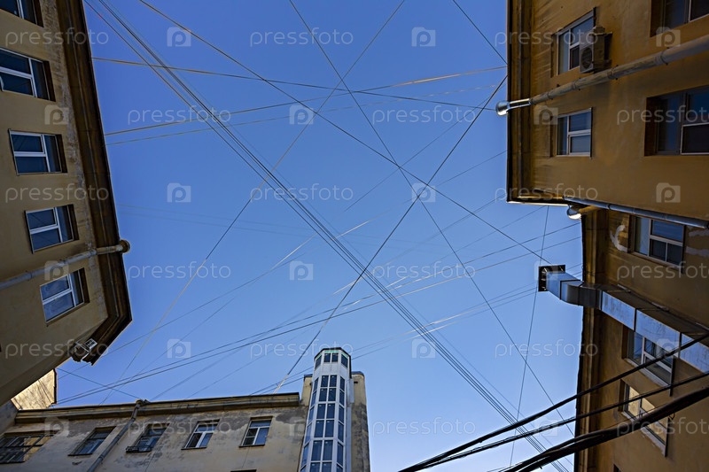 Провода в голубом небе, загрязненное пространство городского неба и городской пейзаж, фон