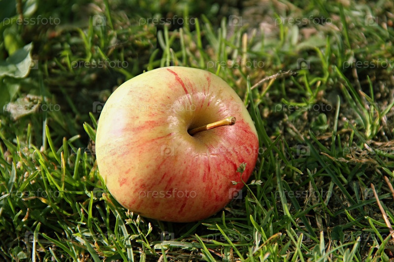 Свежее красное яблоко, лежащее на зеленой траве в саду