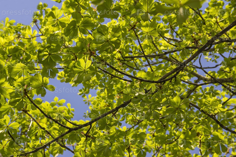 Первые весенние нежные листья, почки и ветви каштана, Кастанея, крупным планом на размытых ветвях и фоне неба