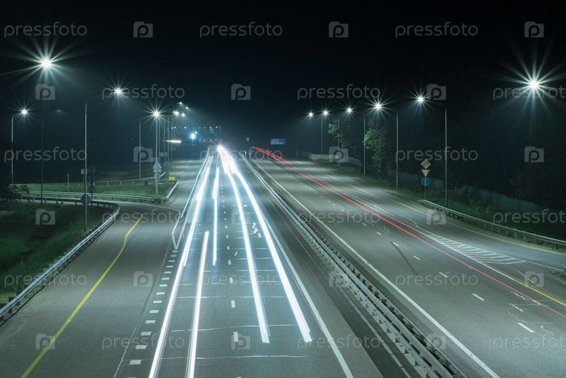 Ночная дорога с длинными полосами красного и белого света от фар автомобилей. По краям дороги есть уличные фонари