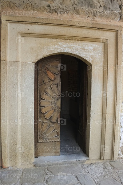 Полуоткрытая двухстворчатая старая деревянная дверь в узоре
