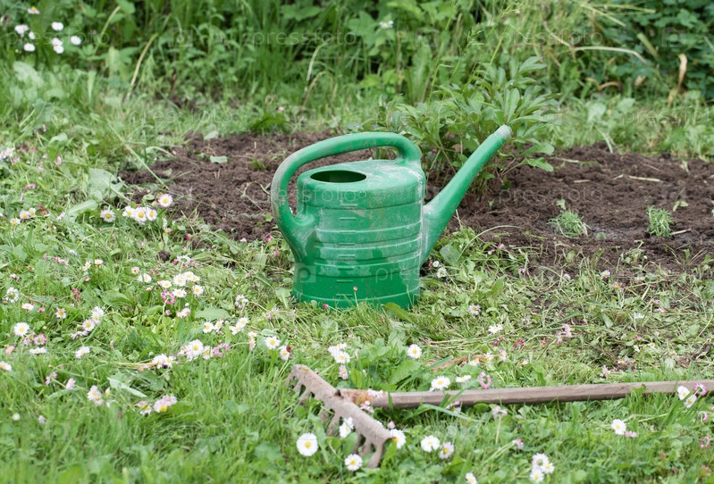 Грязная лейка и грабли в зеленой траве. Садовые инструменты. Садоводство