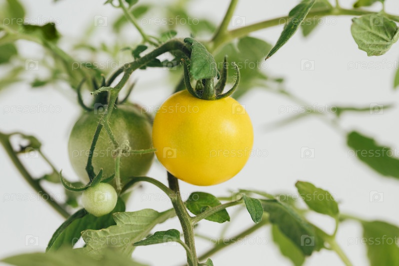 Желтые и зеленые помидоры черри на ветке крупным планом. Помидоры растут на кусте на белом фоне