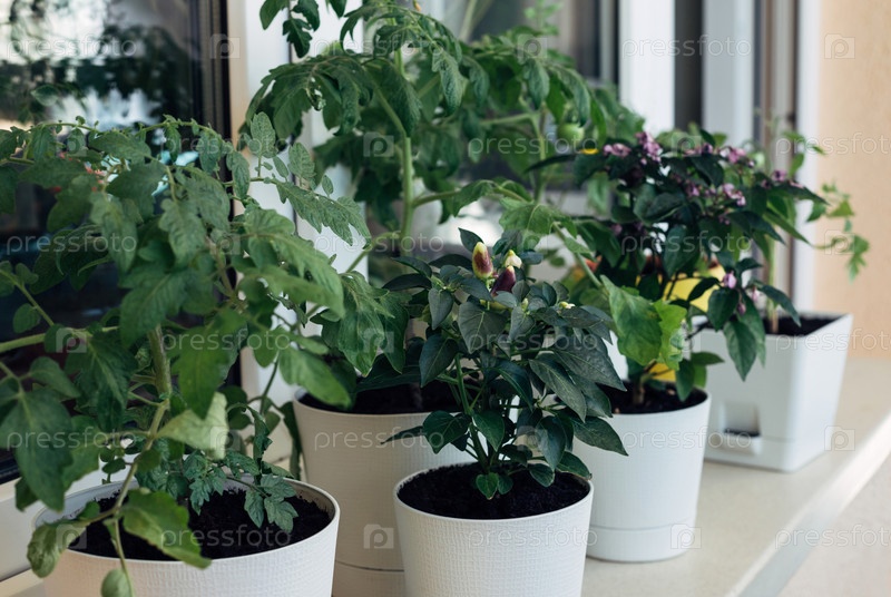 Огород на террасе. Помидоры и перцы растут в цветочных горшках. Кухонный сад