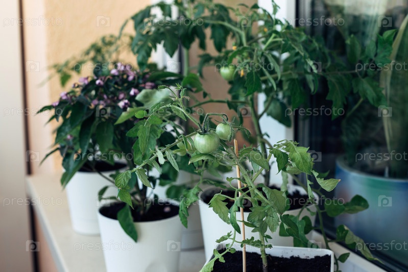 Кусты помидоров черри, выращенные в домашних условиях. Огород на подоконнике. Зеленые помидоры в цветочных горшках