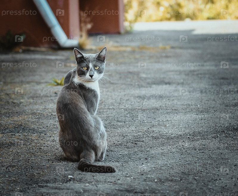 Серый белый кот сидит на тротуаре. Бездомный грустный задумчивый одинокий бродячий кот на фоне асфальта. Смотрят с обеих сторон. Изящная поза