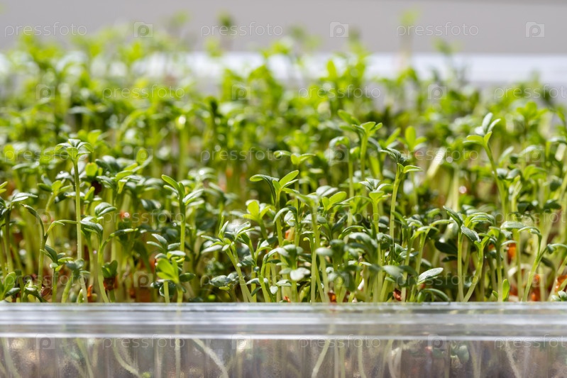 Микро зеленый крупным планом. Проращивание семян кресс-салата. Пророщенная микрозелень салата из кресс-салата. Дом и Сад. Веганская еда