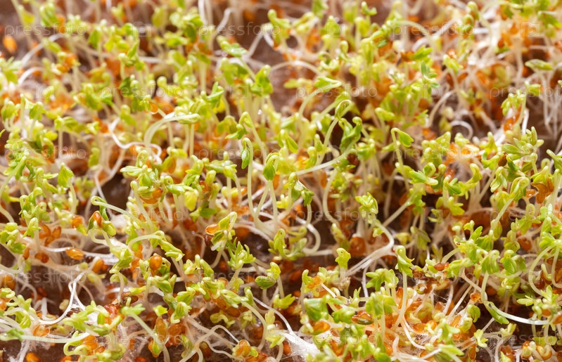 Микрозелень. Салат из молодых ростков кресс-салата. Выращивание микрозелени в домашних условиях. Фон проросших семян крупным планом
