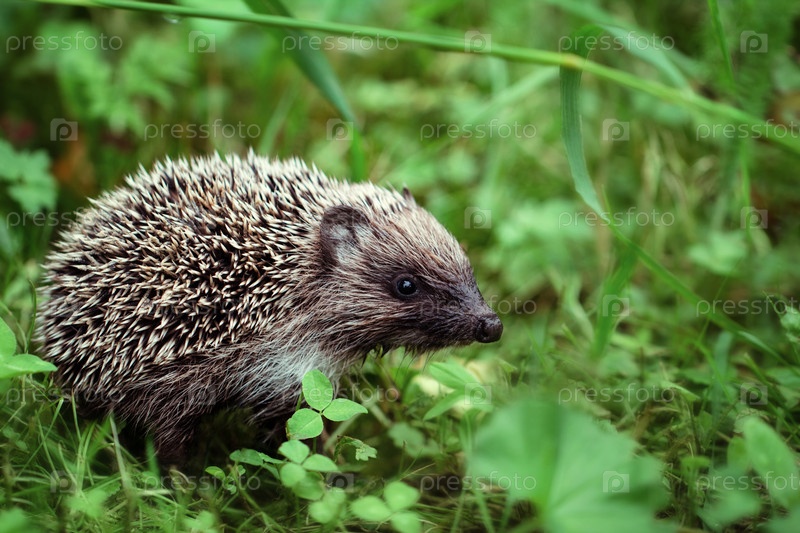 Милый маленький ежик в лесу крупным планом. Серый колючий ежик на зеленом фоне, макрос. Красивый ежик с мокрым носом в траве в саду. Вид сбоку