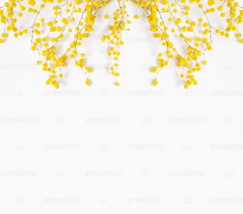 Цветочная граница с желтой акацией на белом фоне. Скопируйте пространство, вид сверху
