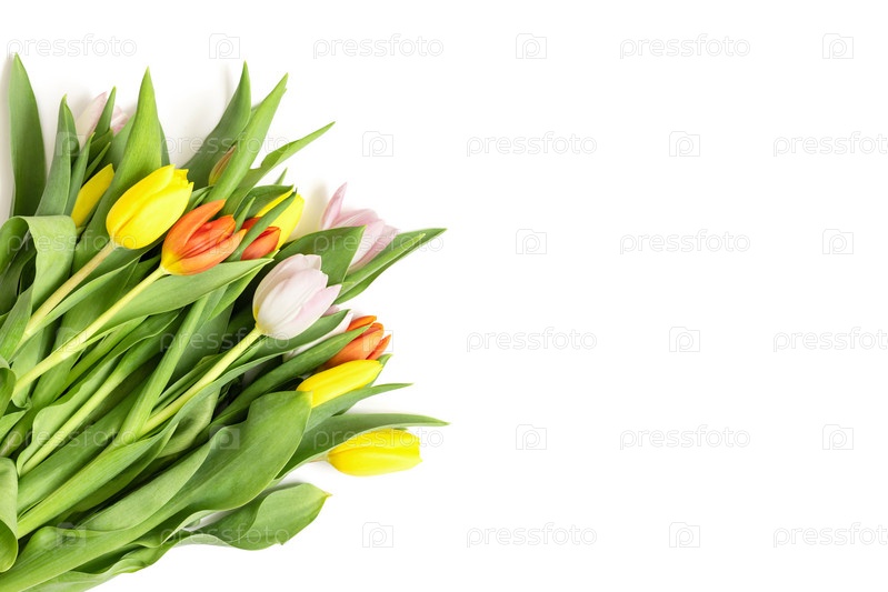 Букет тюльпанов, изолированные на белом фоне. Цветочная композиция. Женский день, День святого Валентина и весенняя концепция. Скопируйте пространство, вид сверху