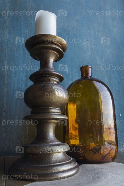 Большая коричневая стеклянная банка с монетами и массивным подсвечником с белой свечой на синем потрепанном фоне стены, концепция сбережений, торговли, сбережений или экономии электроэнергии