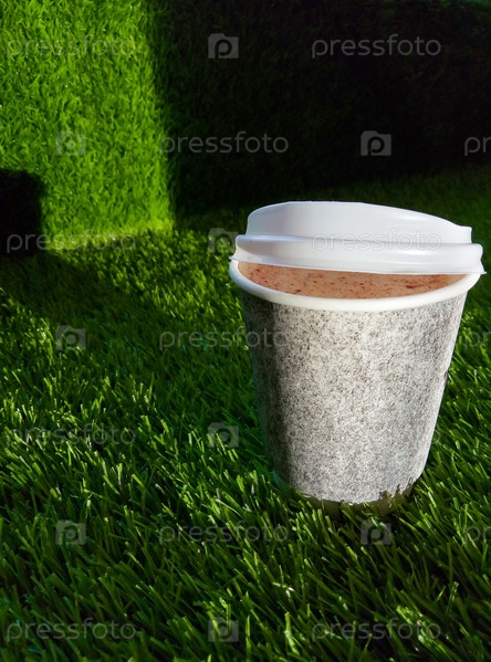Бумажная чашка кофе и овсяное молоко и корица на зеленом синтетическом газоне на фоне солнечного света
