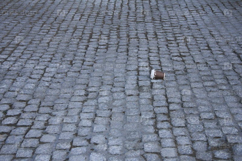 Использованная бумажная чашка кофе, чая, брошенная на каменный тротуар - символ загрязнения
