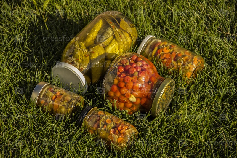 Маринованная еда. Ассортимент осенних консервов. Банки с маринованными овощами. Запечатывание сельскохозяйственных овощей в банках