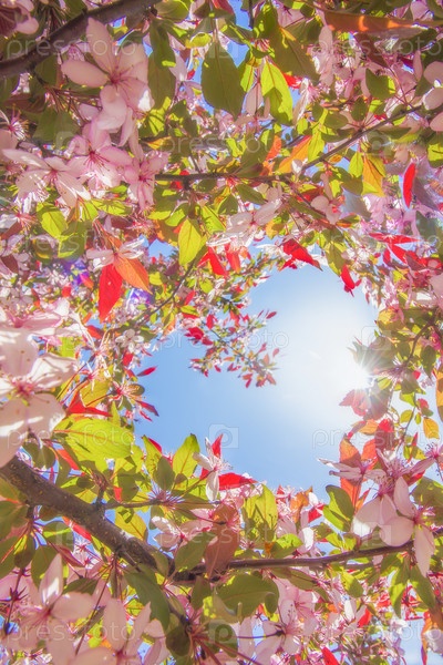 Плетение весенних вишневых цветов и ветвей в форме сердца, розовые цветы, на фоне неба