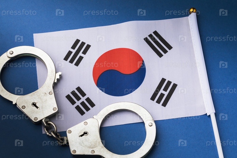 Флаг Южной Кореи и наручники на синем фоне, концепция на тему преступности в стране, вид сверху