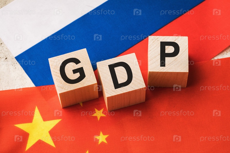 Деревянные кубики с текстом на фоне флагов, концепция на тему сравнения ВВП России и Китая