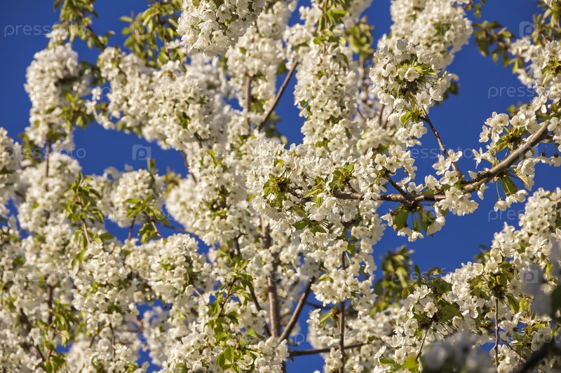 Весенние вишневые цветы на ветке, белые цветы, на зеленом фоне природы и неба