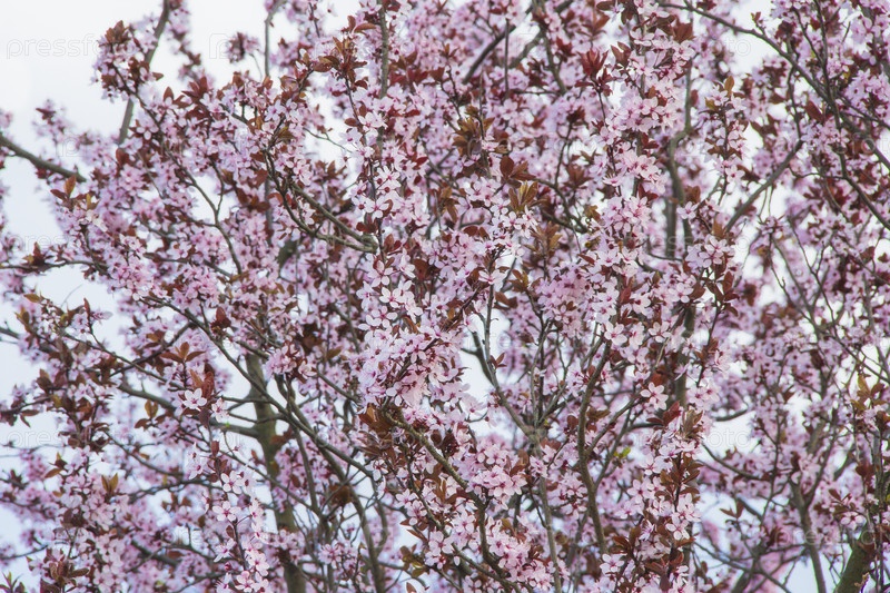Весенние вишневые цветы на ветке, розовые цветы, на зеленом фоне природы или неба