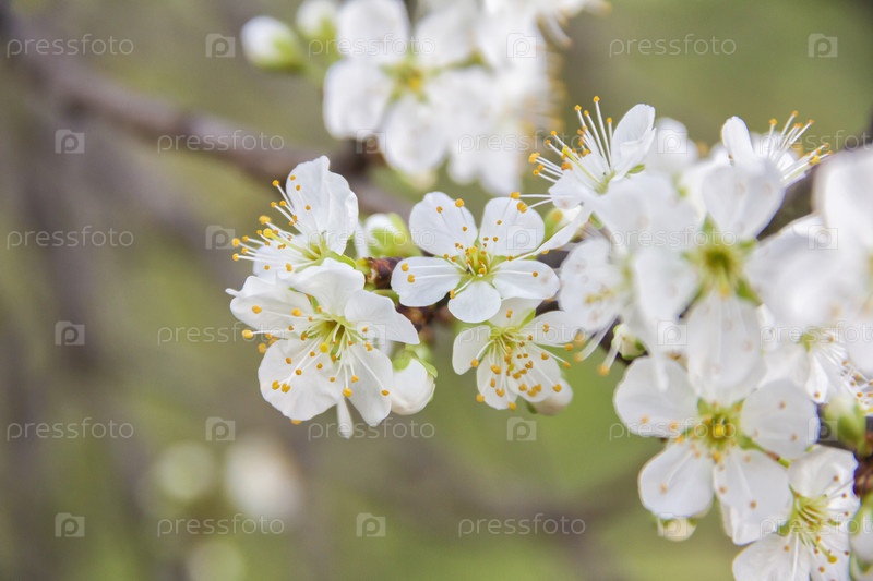 Весенние вишневые цветы на ветке, белые цветы, на зеленом фоне природы и неба