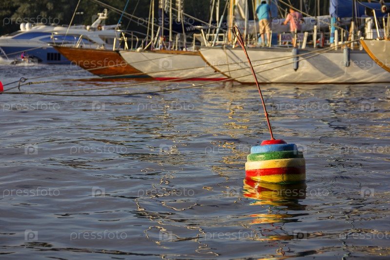 Морская часть яхты со шнурами, такелажем, парусом, мачтой, якорем, узлами на яхтах, привязанных к буям на причале яхт-клуба