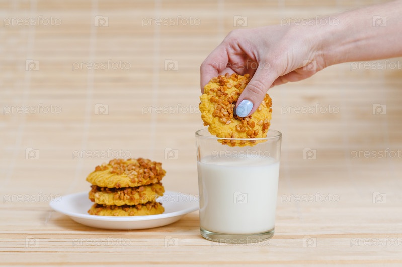 Женская рука держит круглое печенье над стаканом молока
