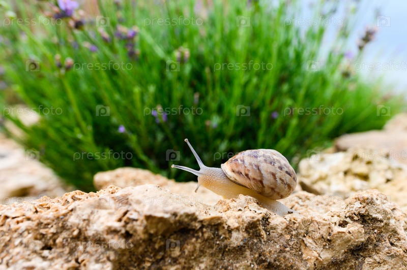 Большая улитка ползает по камню на фоне цветов лаванды. Селективный фокус на улитке