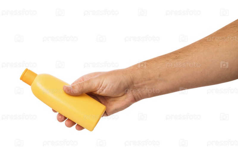 Рука держит гигиенический продукт, шампунь на белом фоне, шаблон для дизайнеров