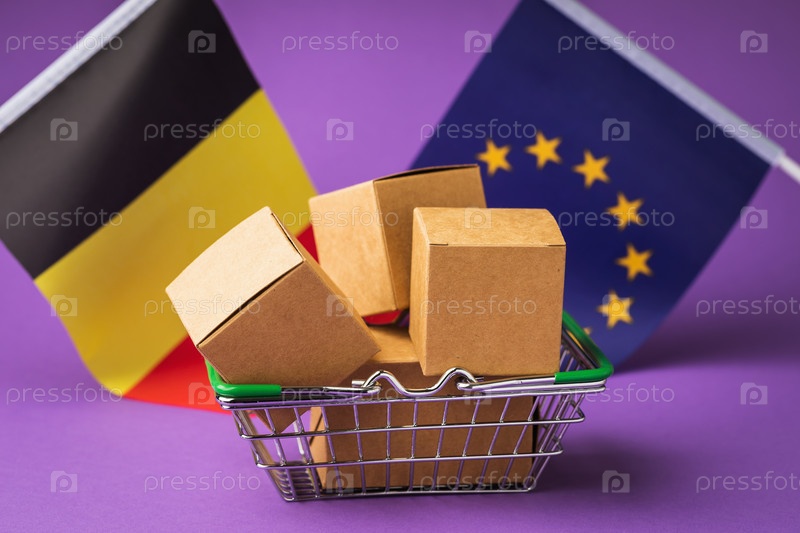 Картонные коробки в продуктовой корзине и флаги на цветном фоне, концепция на тему распространения бельгийских товаров в Европейском Союзе