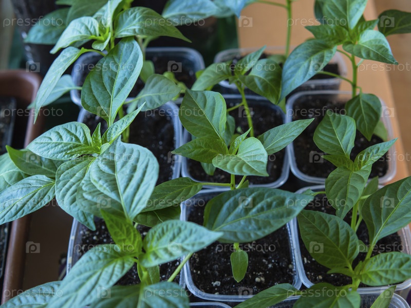 Вид сверху на рассаду перца в солнечном свете. Низкорослые ростки перца выращивают в домашних условиях в ящиках. Ростки перца, выращенные из семян. Саженцы болгарского перца в стаканчиках у окна крупным планом