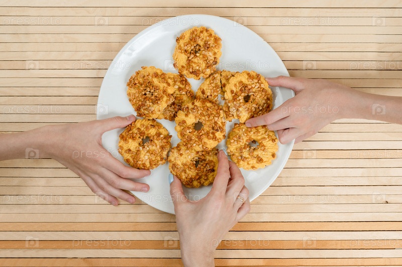Три руки тянутся к свежему домашнему печенью. Много печенья лежит на большой белой тарелке