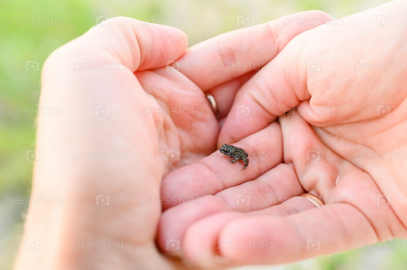 Очень маленькая лягушка в человеческих ладонях. Концепция защиты животных