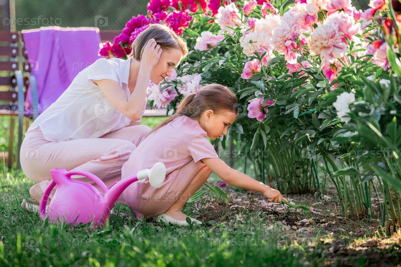 Мама и дочка в льняном розовом платье ухаживают за пионами в саду на даче, поливают цветы. Он прекрасно улыбается и смеется. Озаренный лучами вечернего заходящего солнца
