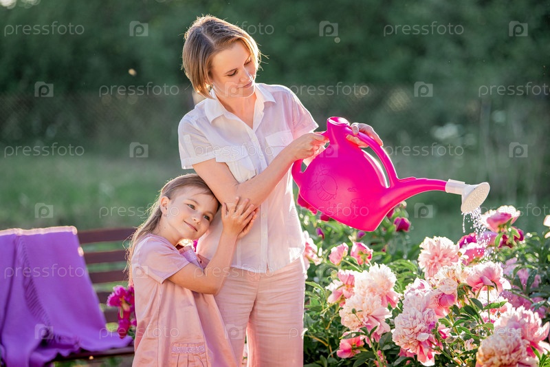 Мама и дочка в льняном розовом платье ухаживают за пионами в саду на даче, поливают цветы. Он прекрасно улыбается и смеется. Озаренный лучами вечернего заходящего солнца