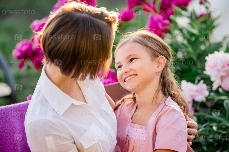 Прикладные семейные отношения. Мама и дочь сидят на скамейке и болтают в саду среди цветов солнечным летним вечером