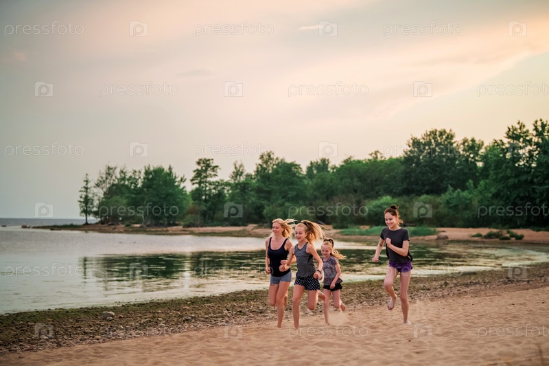 Дети и взрослые девушки бегают по побережью в спортивной одежде на фоне природы на закате
