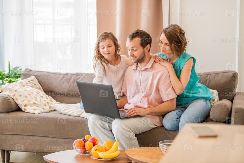 Счастливая семья, мама, папа и дочь сидят на диване и вместе смотрят на монитор ноутбука