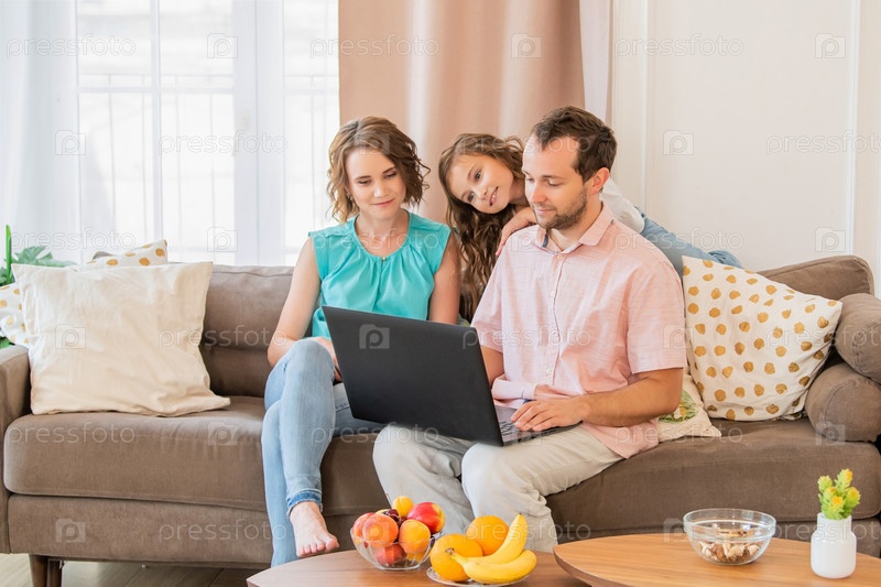 Счастливая семья, мама, папа и дочь сидят на диване и вместе смотрят на монитор ноутбука