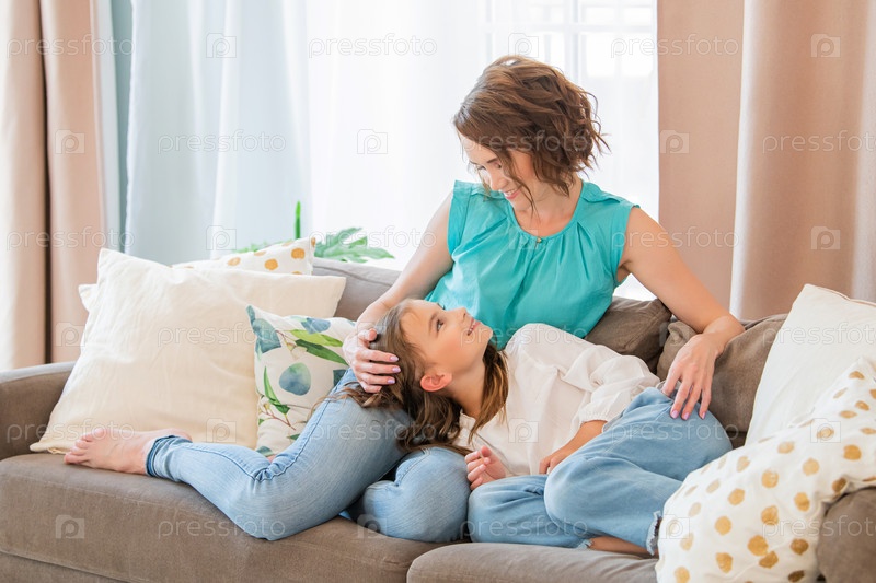 Дочь-подросток лежит дома на коленях у счастливой матери. Мама гладит ребенка по голове