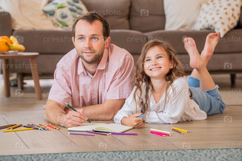 Отец и дочь рисуют вместе, лежа на полу в квартире