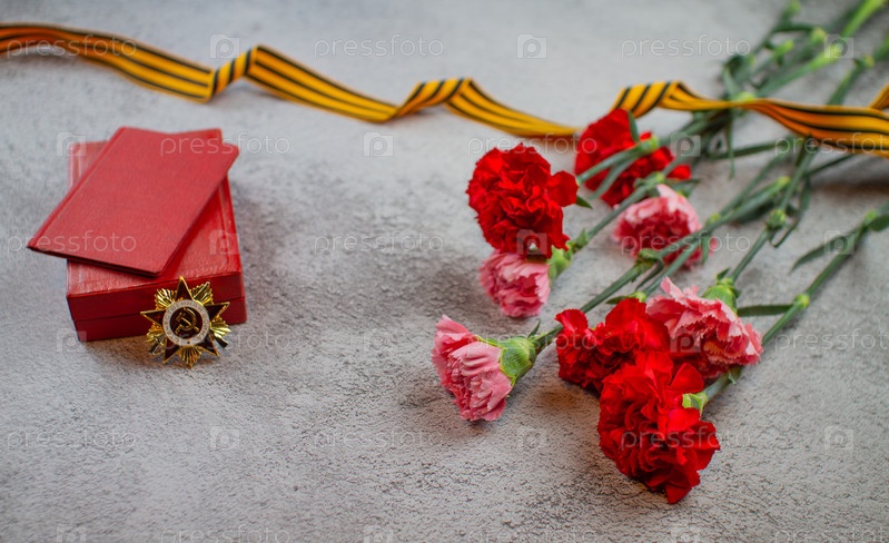 Орден Отечественной войны, георгиевская лента, орденская книжка и цветы на заднем плане. Композиция ко Дню Победы