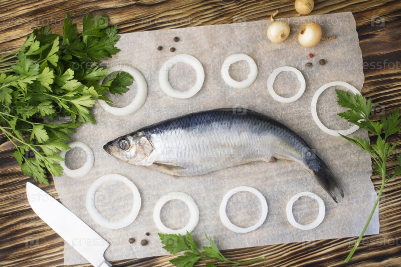 Соленая сельдь с луком и петрушкой на фоне старых деревянных. Свежая рыба Сельдь