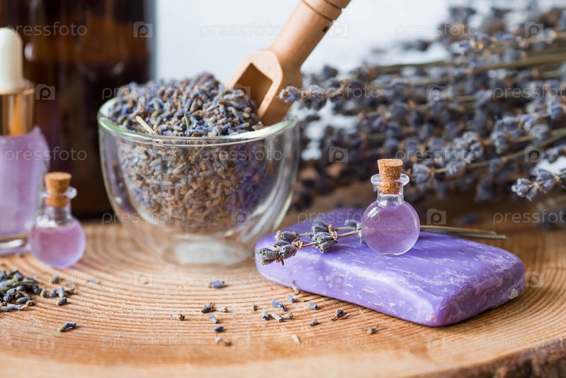 Ароматерапия. Массаж и спа. Косметические бутылки эфирного масла лаванды, сушеные цветы и семена лаванды на деревянной подставке. Натуральная косметика для тела