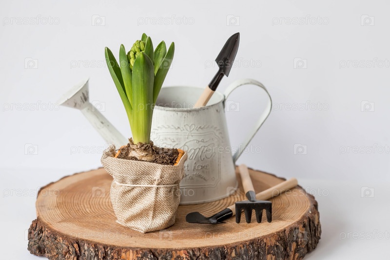 Цветок гиацинта с садовыми инструментами и лейкой изолирован на белом фоне. Концепция садоводства. Высадка. цветы весной