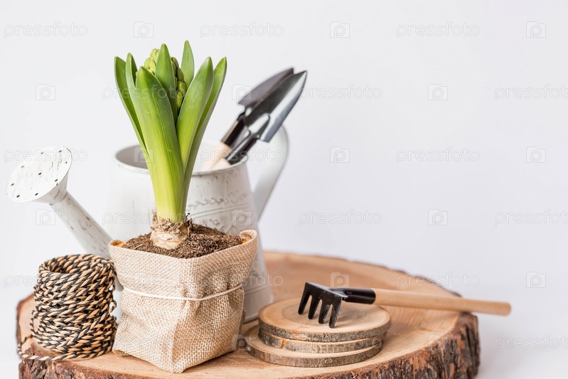 Цветок гиацинта с садовыми инструментами и лейкой изолирован на белом фоне. Концепция садоводства. Высадка. цветы весной