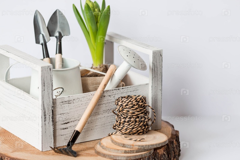 Цветок гиацинта с садовыми инструментами и лейкой изолирован на белом фоне. Концепция садоводства. Высадка. цветы весной