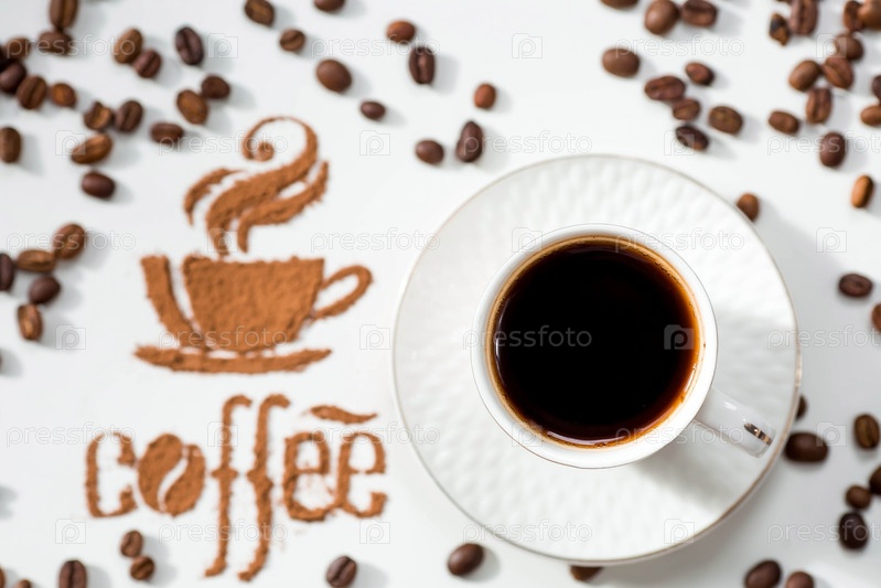 Горячие напитки. Надпись «Кофе», кофейные зерна и чашка кофе или чая сделаны из молотого кофе на белом изолированном фоне. Баннер