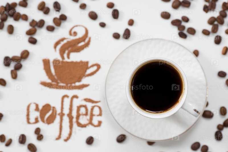 Горячие напитки. Надпись «Кофе», кофейные зерна и чашка кофе или чая сделаны из молотого кофе на белом изолированном фоне. Баннер