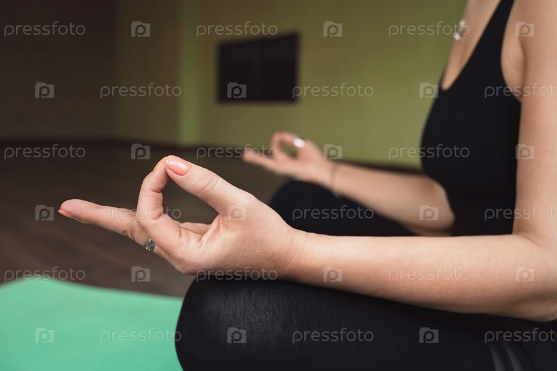 Женщина, практикующая йогу, занимающаяся медитацией в позе лотоса и выполняющая руками символ джняна мудры, или мудры знания, тренируется одна в комнате